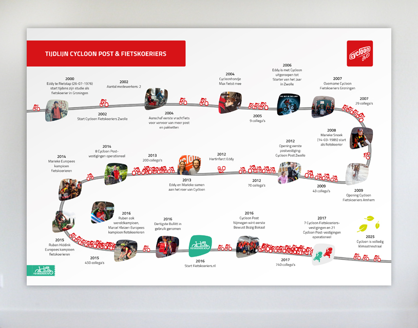 Vandaag de dag bestaat Cycloon uit twee bedrijven: Cycloon Fietskoeriers en Cycloon Post. Wat in 2000 begon als een lokaal fietskoeriersbedrijf in Groningen groeide door de jaren heen uit tot een bedrijf met vestigingen in meerdere dorpen en steden. Elke dag weer zijn ze hun klanten van dienst met eerlijke, transparante en kwalitatief hoogwaardige diensten op het gebied van post en logistiek. Dit doen ze met oog voor mens en milieu. In alles wat ze doen willen ze maatschappelijke impact hebben. Voor hun werknemers en hun omgeving.
