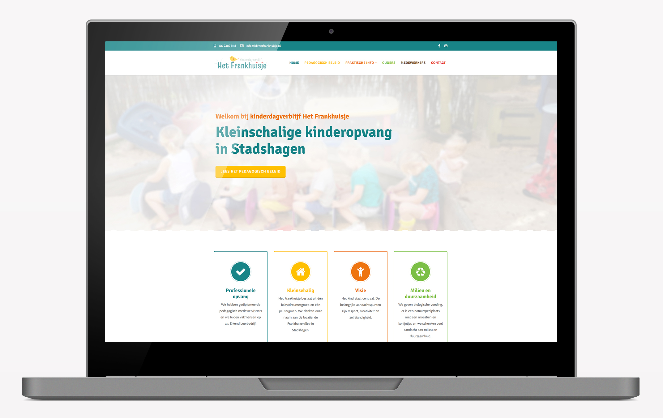 Het Frankhuisje is een kleinschalig kinderdagverblijf voor kinderen van 0 tot 4 jaar. Er is één baby/dreumesgroep en één peutergroep. Door middel van duurzaam ondernemen willen ze een goed voorbeeld geven en een bijdrage leveren aan een goede verzorging van de kinderen, de medewerksters en de wereld om ons heen. Ze geven biologische voeding, er is een natuurspeelplaats met een moestuin en konijntjes en ze schenken veel aandacht aan milieu en duurzaamheid.