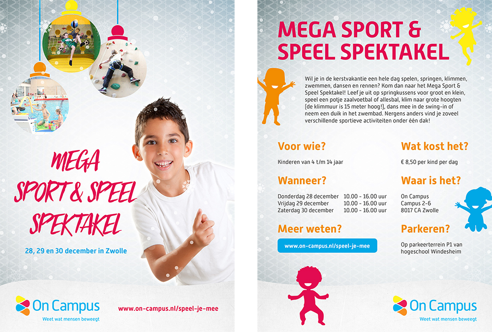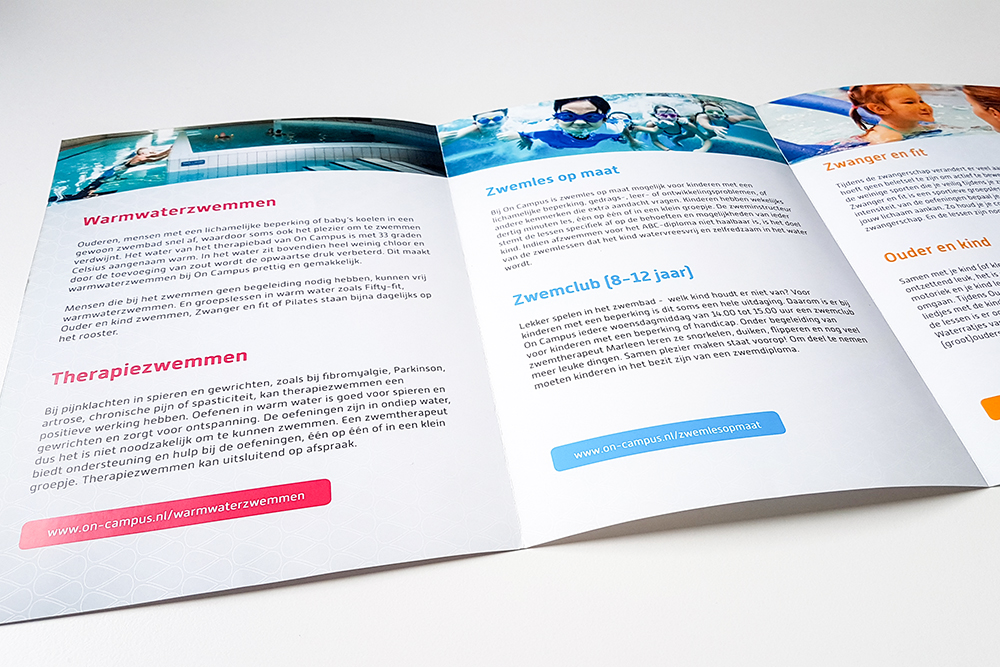 On Campus is een modern, multifunctioneel sportcomplex in Zwolle, naast hogeschool Windesheim. Met drie zwembaden, een fitnesscentrum, klimmuur, judozaal en 14 sportzalen vind je hier altijd een sport die bij jou past. Zwemmen is een ideale sport voor jong en oud. En wie van zwemmen houdt, is bij On Campus aan het goede adres. In het wedstrijdbad, instructiebad en therapiebad zijn veel mogelijkheden om te zwemmen of bewegen in (warm) water. Bezoekers met én zonder beperking kunnen bij On Campus rekenen op doelgerichte ondersteuning op maat.